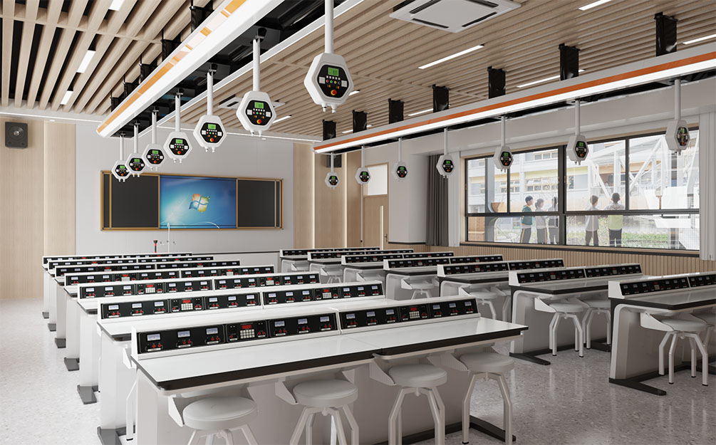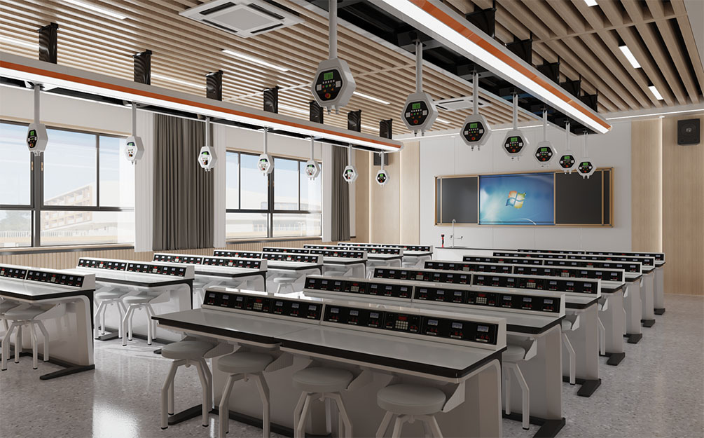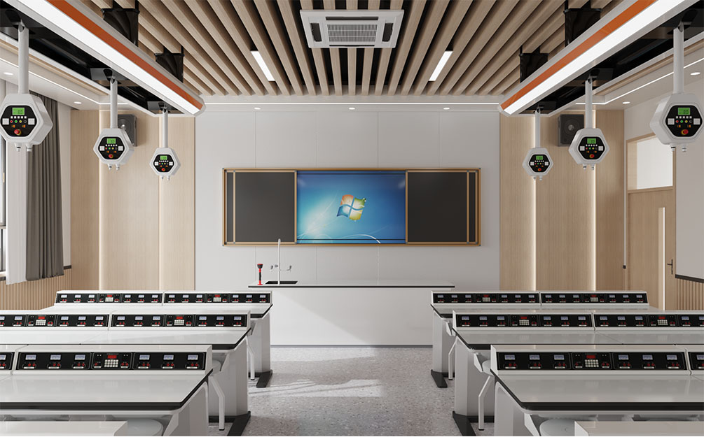 灵活摆放,将实验室所需要的风、水、电、网络等一体集中于顶部,节省空间的灵活布局可根据上课教育需要调节,自动一体化,中央控制提高实验室教学效率。
