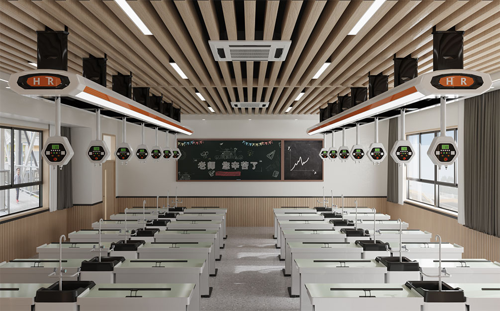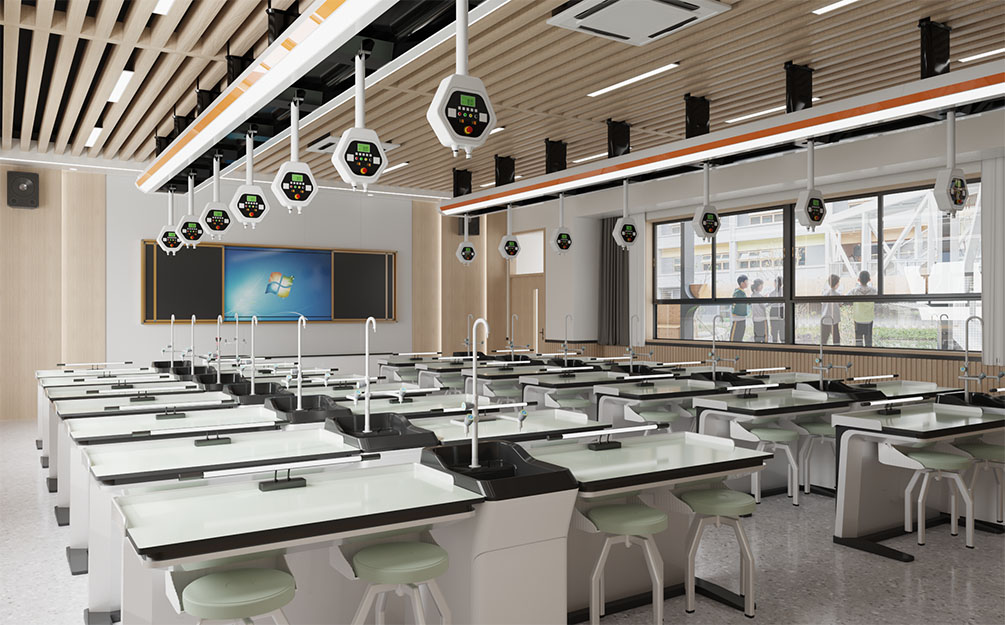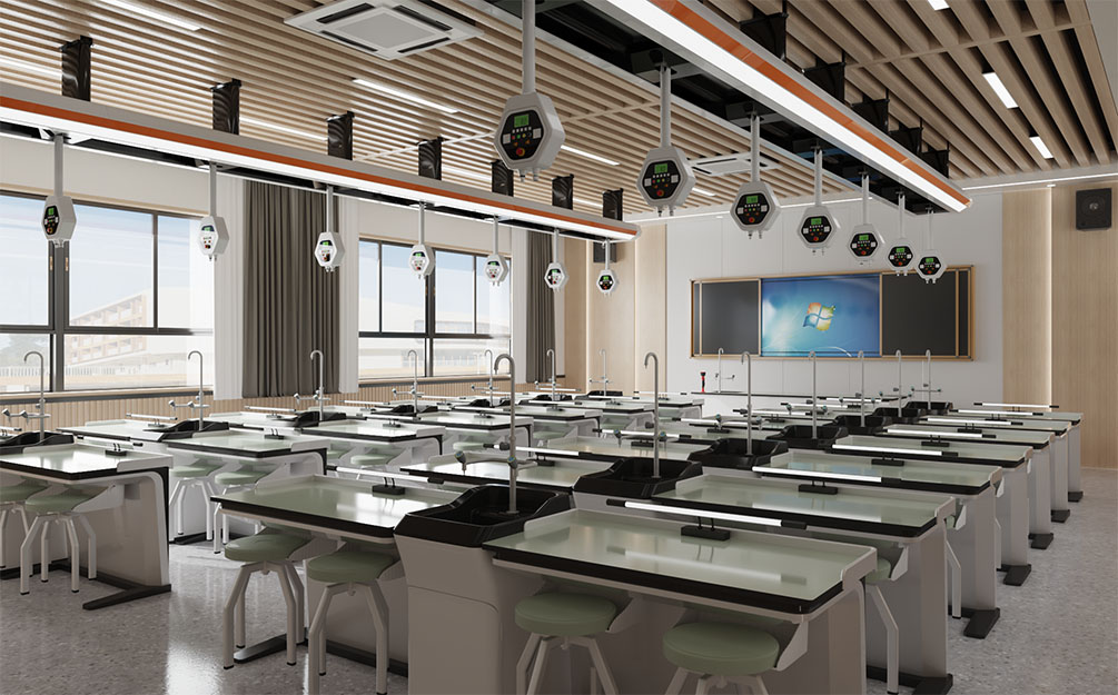 灵活摆放,将实验室所需要的风、水、电、网络等一体集中于顶部,节省空间的灵活布局可根据上课教育需要调节,自动一体化,中央控制提高实验室教学效率。