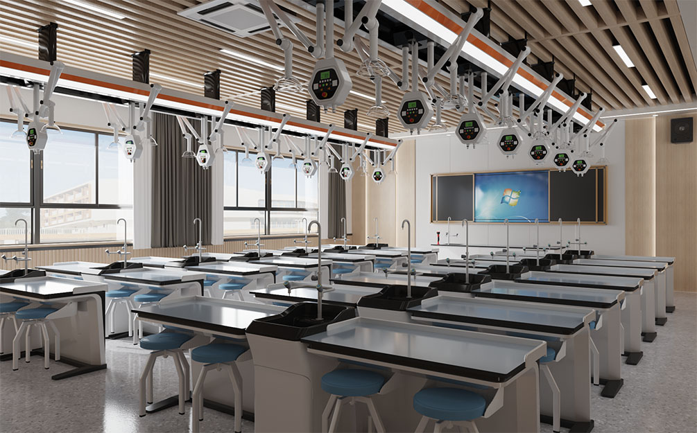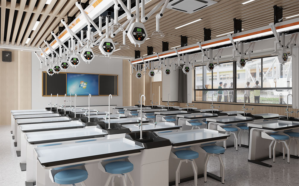 灵活摆放,将实验室所需要的风、水、电、网络等一体集中于顶部,节省空间的灵活布局可根据上课教育需要调节,自动一体化,中央控制提高实验室教学效率。