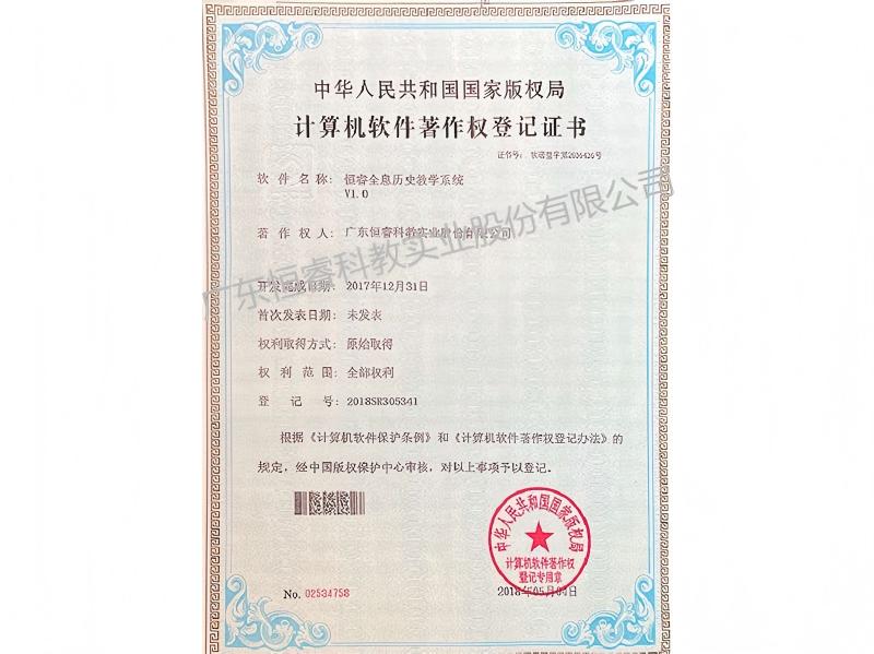 恒睿全息历史教学系统证书